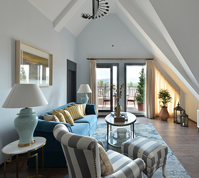 整体暖色墙面肌理感丰富,搭配宫廷品牌家具,整个环境氛围凝聚优雅气质,像是在海洋和天空中手捧一簇盛开的香槟玫瑰。