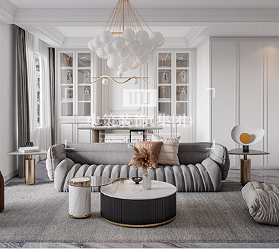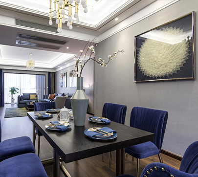 硬装设计摒弃繁琐的设计语言,以简约流畅的设计线条为主,灰蓝色的布艺和木质相互映衬,赋予空间优雅含蓄的气质。