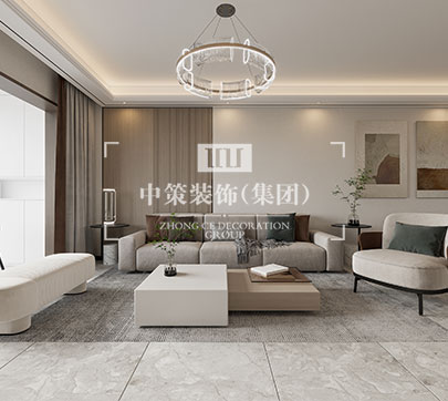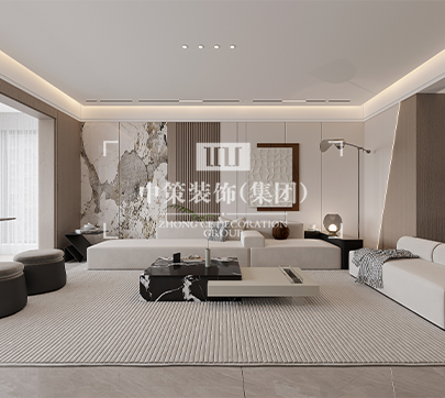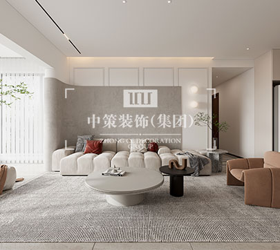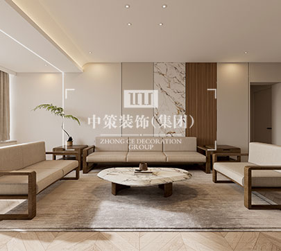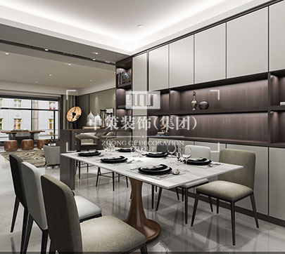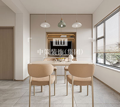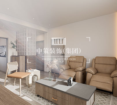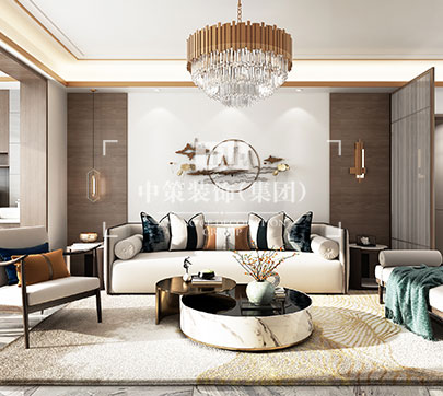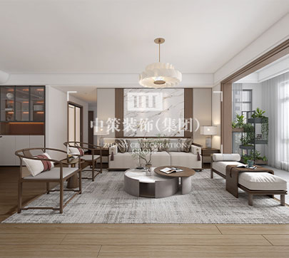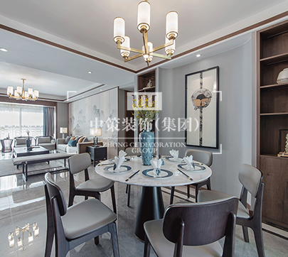 此户型居住人口为三人,在满足客户需求的前提下,其中书房打开,与客厅形成一个开放式的空间,每间主要卧室配备独立衣帽间,有独立的吧台!整体格调以新中式为主基调