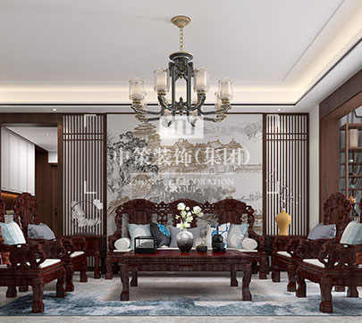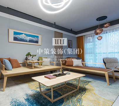 本案设计师将唐朝诗人王勃的“ 落霞与孤鹜齐飞,秋水共长天一色”一诗融入客厅之中。抹去了传统客厅电视,选用了一幅颇具朦胧美的山水人文画作。浓郁的书香气息突显温润质感,让整个空间的氛围充满了文艺气质的格调。