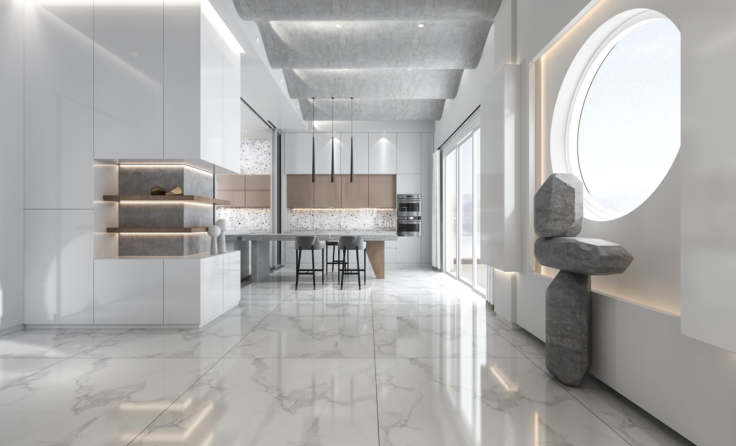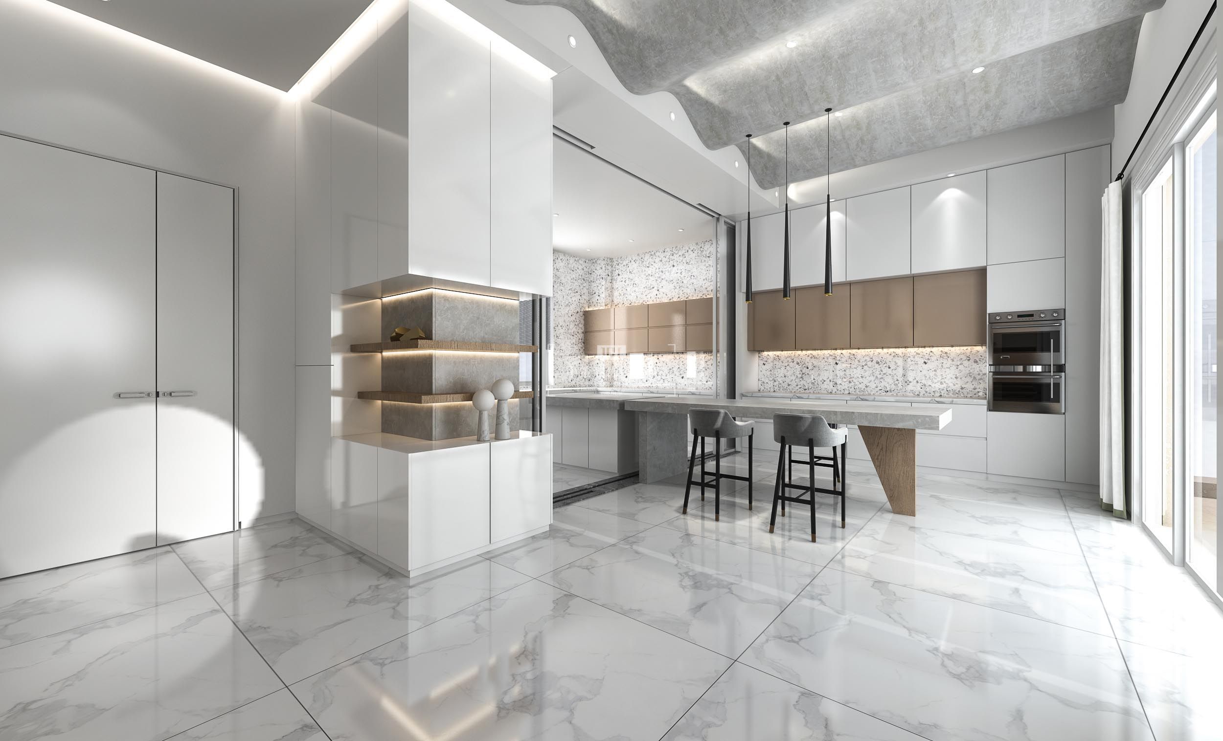 以现代风格为基调,透过构成主义的手法表现空间的“势”,纯白色系为主,低彩度软装为辅,再通过光提升空间的暖度,通过光分割不同材质、几何形,营造出悬浮装置表达一种原始的视觉张力与和谐感