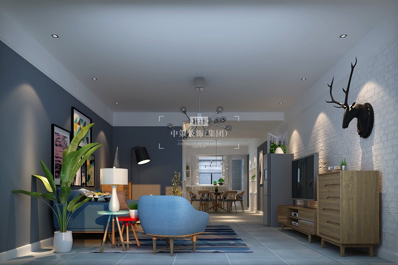2、 客厅说明:客厅大胆采用了经典的深灰蓝色、带有复古感觉的白色文化墙及白色格子窗,不仅表达了在生活中,崇尚自然的情怀,也为空间增添了几许小资情调。
