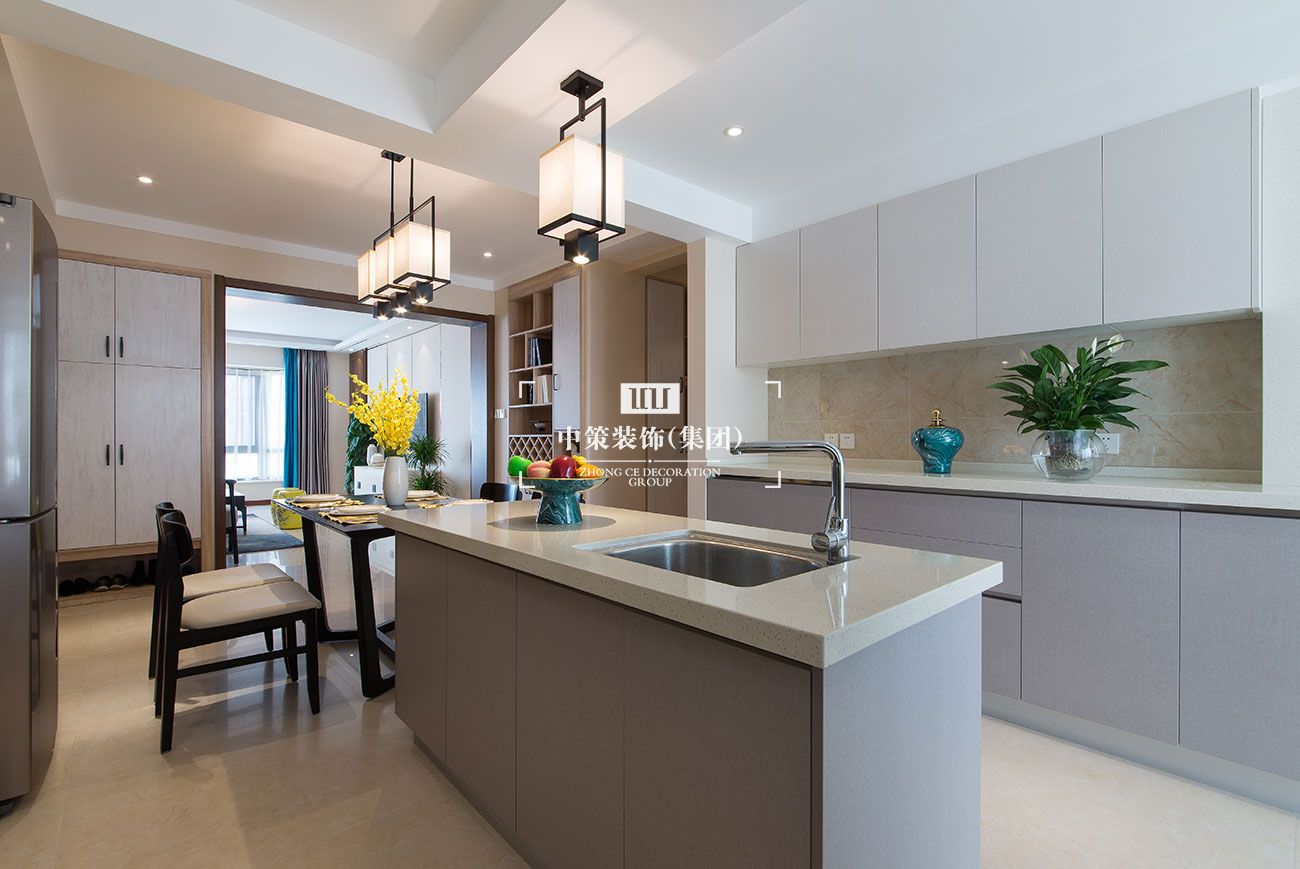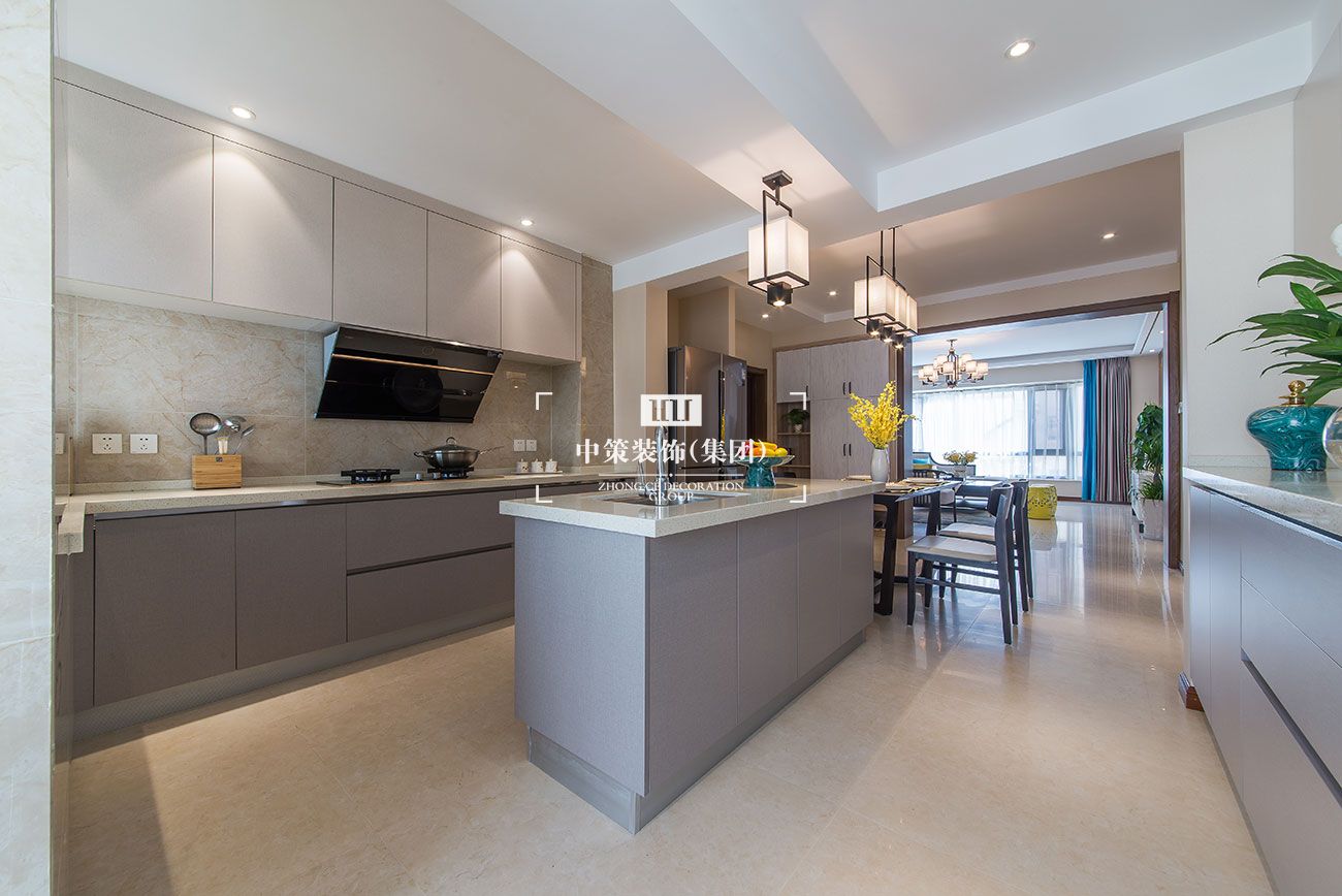 本户型为错层,动静分区明确:台上为休息学习空间,台下为会客娱乐空间。新中式客厅优雅而有气质,以暖色调为主,加入玫瑰金不锈钢线条,使空间舒适温馨也不失现代时尚感。客厅连通休闲阳台、落地窗,阳光直射,约三五好友,品茶谈天,高谈阔论。开放式厨房与餐厅相连,使整个空间更开阔,整体橱柜加中岛的配置,既增加了厨房的储物与实用功能,也增加了餐厅的延展性。基于业主居住情况,将原房四室改为三室,主卧变为一个大套间,囊括了书房和更衣间,使男女主人拥有相对独立的生活空间,且更有生活的品质感。